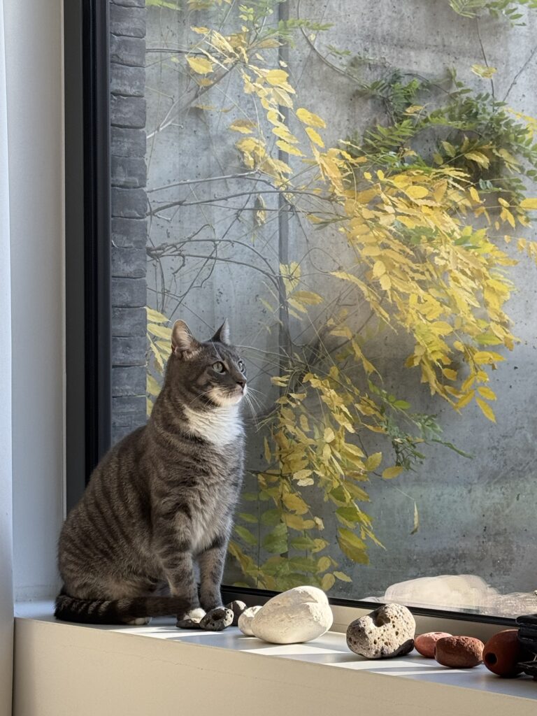 Meet Rocky — once a street cat, now a king of cozy windowsills. Born on the streets but raised at home, he carries a quiet grace and a curious spirit. In this photo, he’s caught in a moment of calm, gazing through the window at golden autumn leaves. The sunlight catches his soft grey stripes